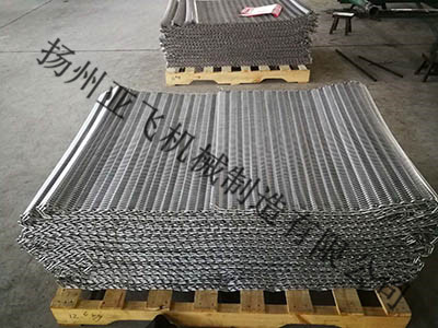 二,网带制作过程中需要清洗表面,去除油污,采用超声波清洗后,再清水漂洗干净,网带安装时需要调整,不跑偏,左右摆偏不大于5MM,方可上料。网带运行一段时间,会有拉长现象,需要及时截断,抽开穿条即可截取多余部分,网带再对接时,只需穿上穿条,封头焊接好即可。